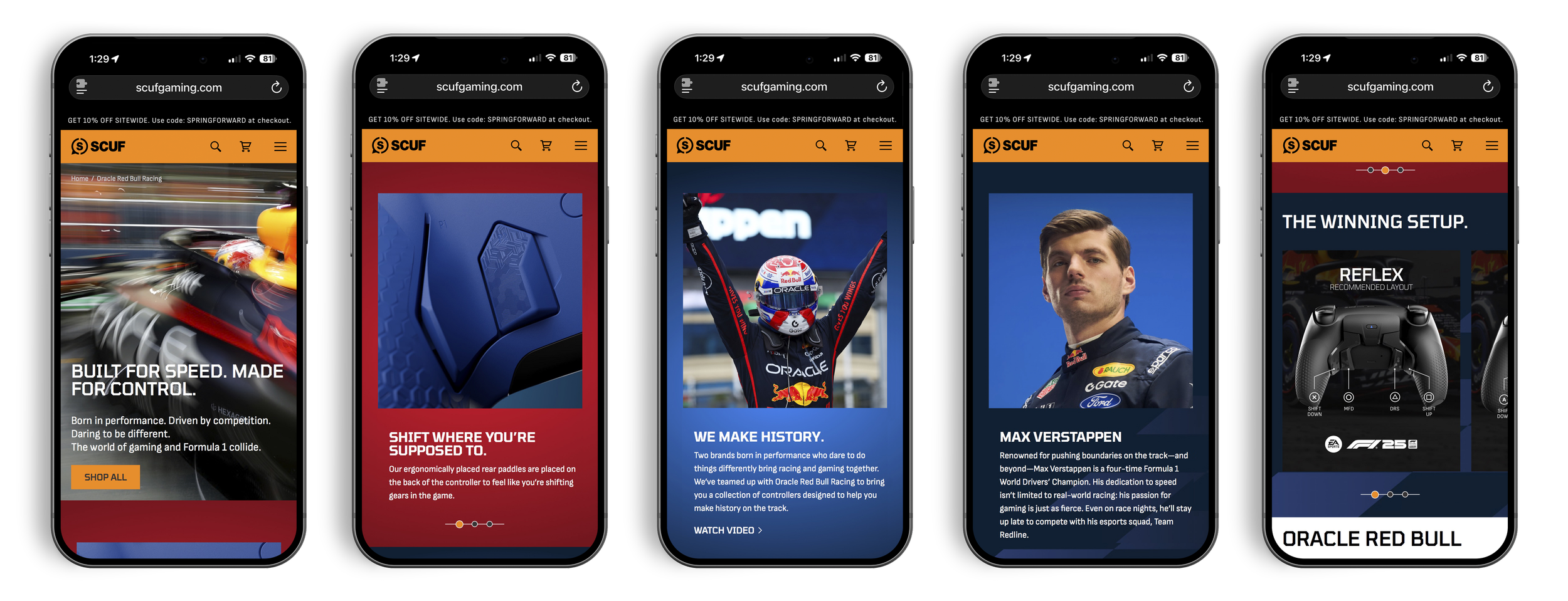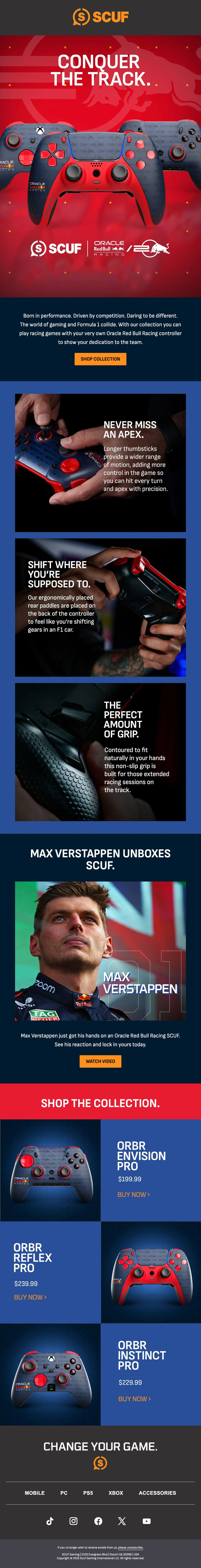 The connection between the two brands was obvious: innovation, performance, and a shared reputation for doing things their own way. Both are built around the pursuit of speed and championships, whether that’s on the track or in competitive gaming. Our campaign leaned into that shared DNA through two themes: “Champions Never Stop” and “Built for Speed.” Over two years and two design collections, we brought the partnership to life through advertising, social content, email, and a dedicated web experience. As a lifelong Formula 1 fan, it was one of the most rewarding projects of my time at SCUF.